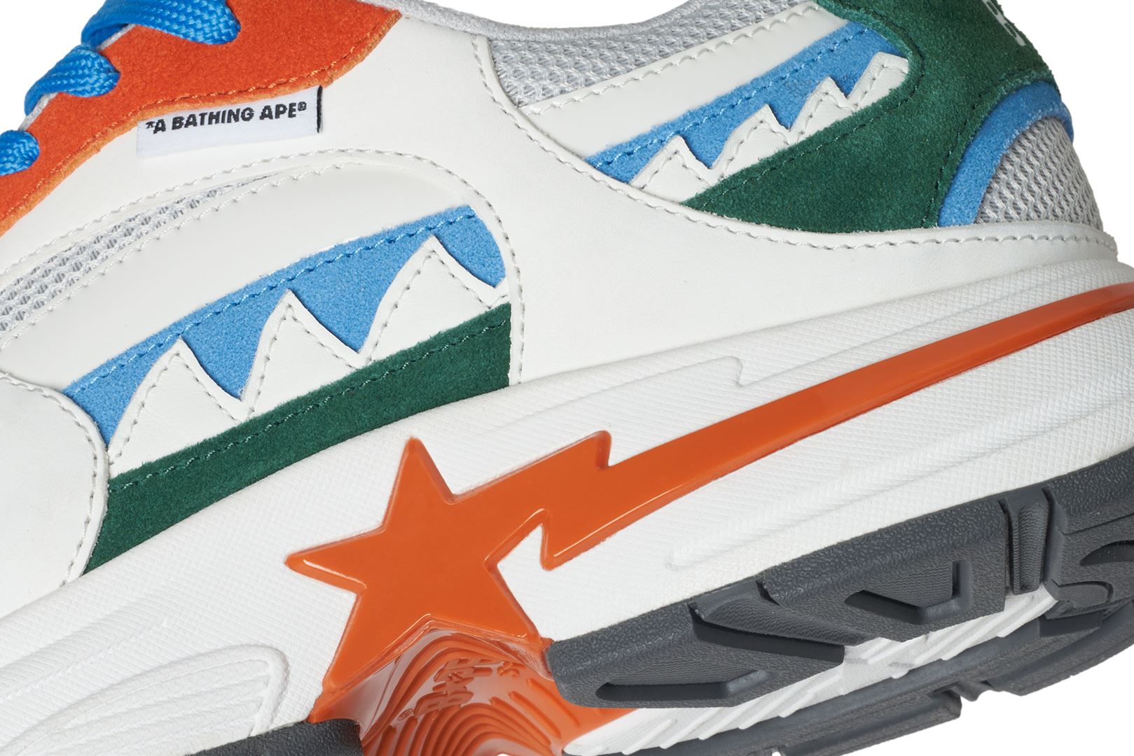 The SHARK STA was inspired by BAPE’s SHARK FULL ZIP HOODIE. It captures the essence of the original hoodie, translated into a footwear silhouette. Most notably, the SHARK STA draws inspiration from the shark face, which has been synonymous with BAPE® since its launch in 2004. Key details include the shark teeth overlay, a prominent midsole STA, gill-inspired branded arch and a chunky outer sole with a wave pattern.