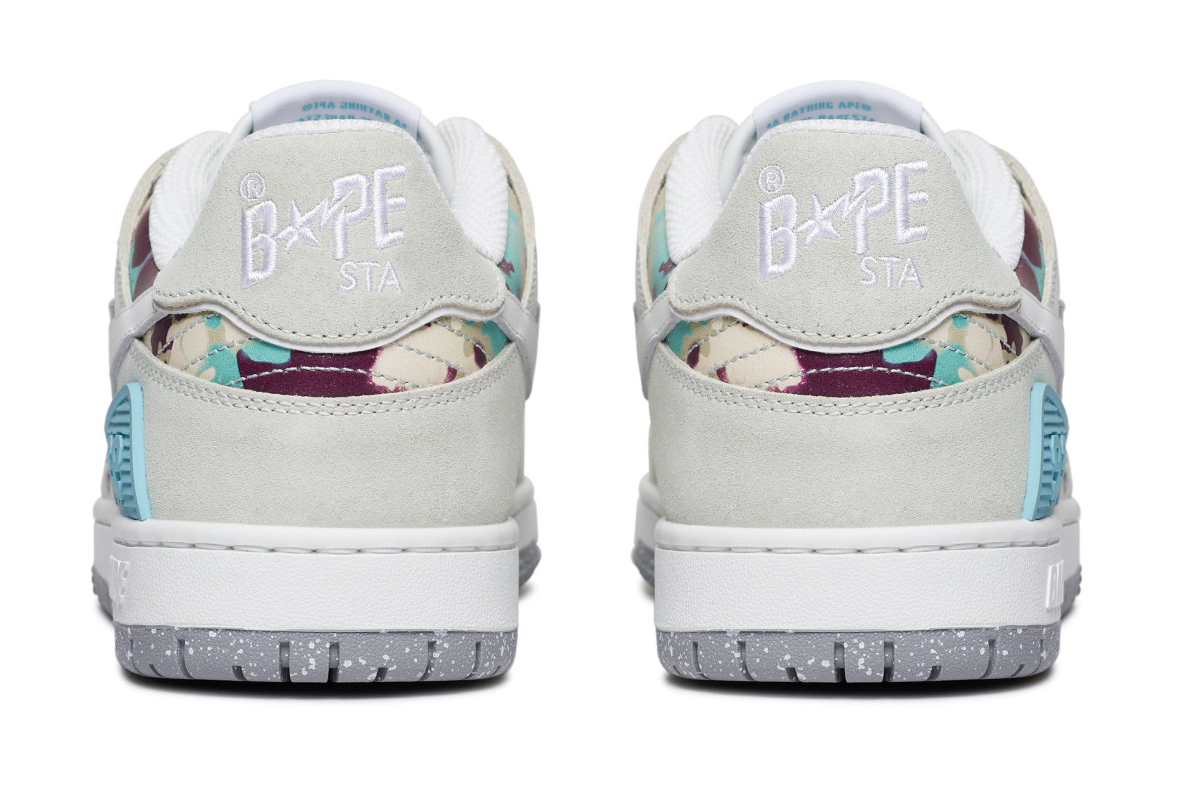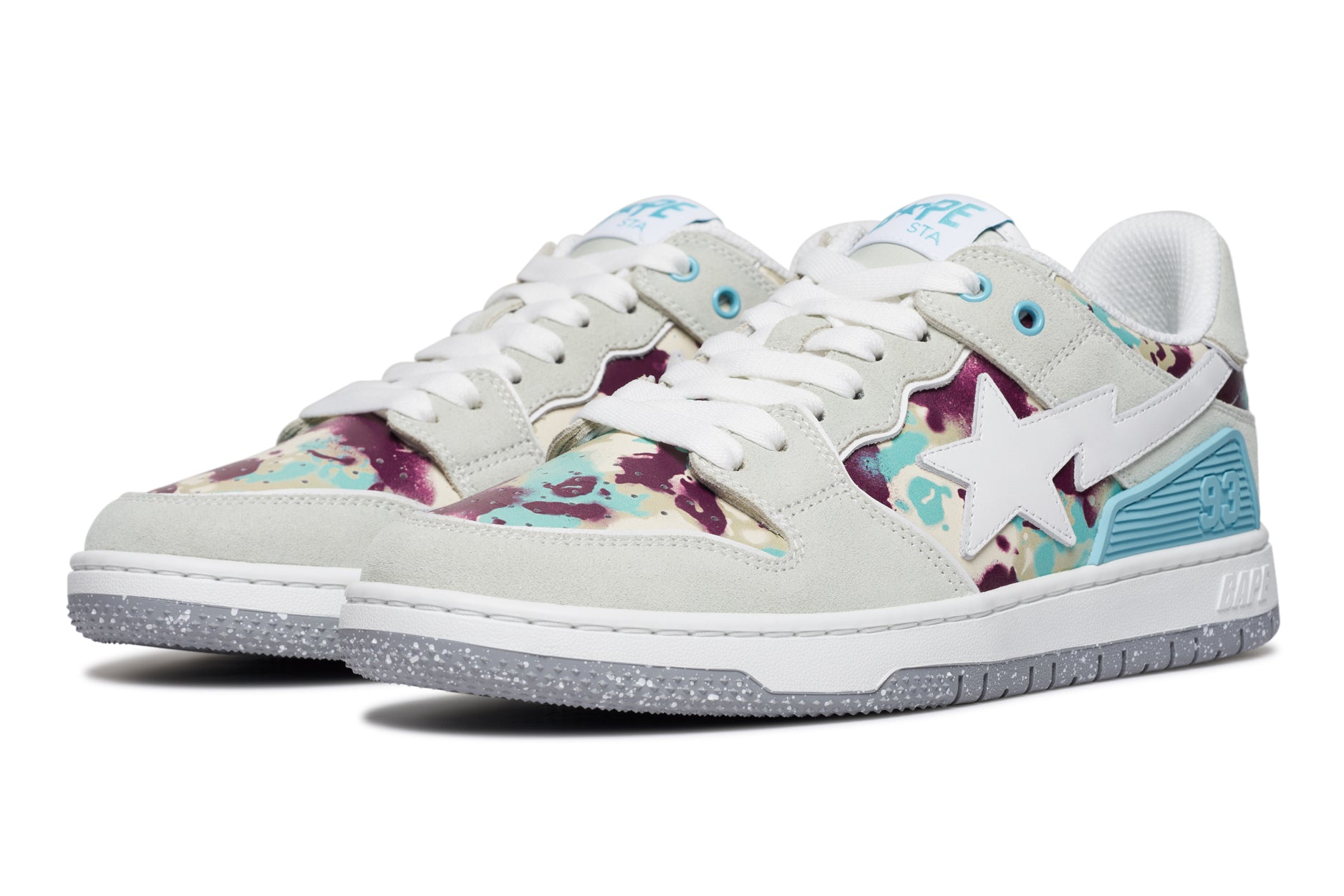 The BAPE SK8 STA features two refined colors with premium calf leather uppers in a camo design. A white leather STA logo and tongue add contrast, while select grey and black styles include suede for extra comfort. The marble-patterned outsole completes the sophisticated look.