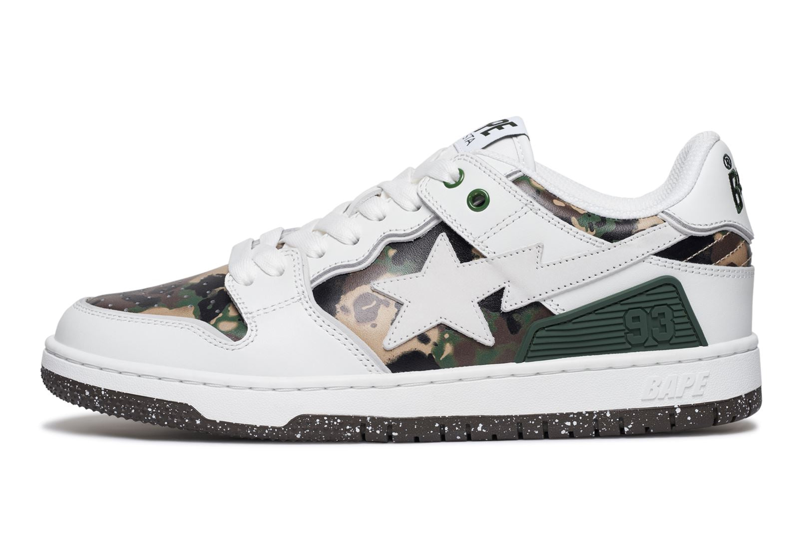 The new BAPE® SK8 STA arrives in three refined colorways complementing the MAP CAMO aesthetic, featuring uppers made from premium calf leather adorned with the camo print, paired with a crisp white calf leather STA logo for a striking contrast.