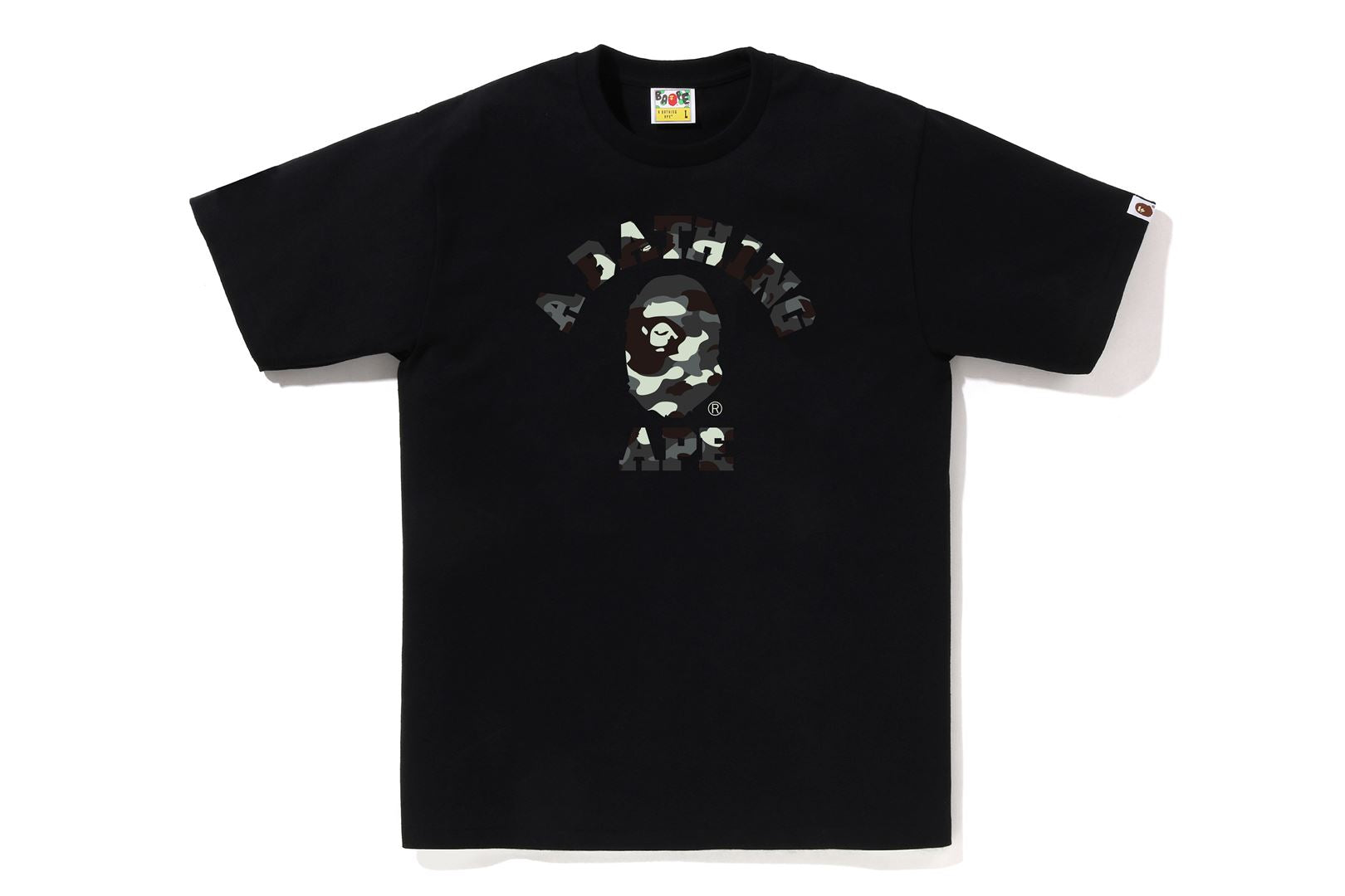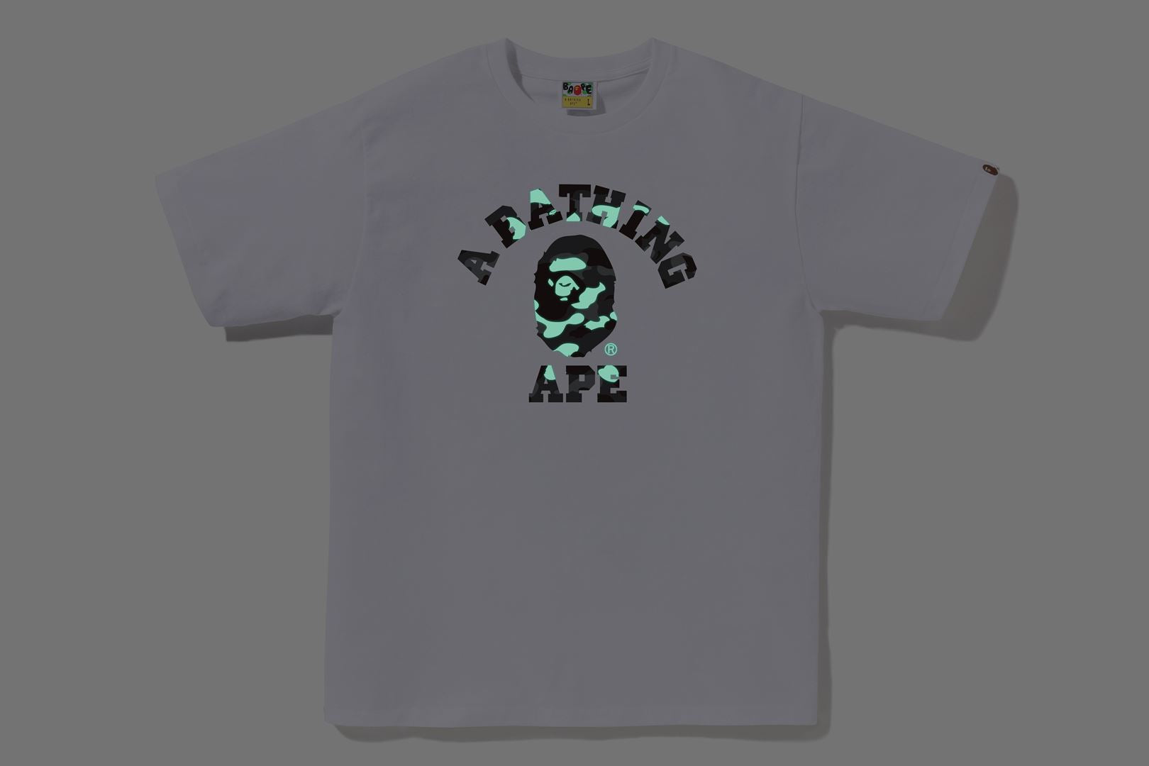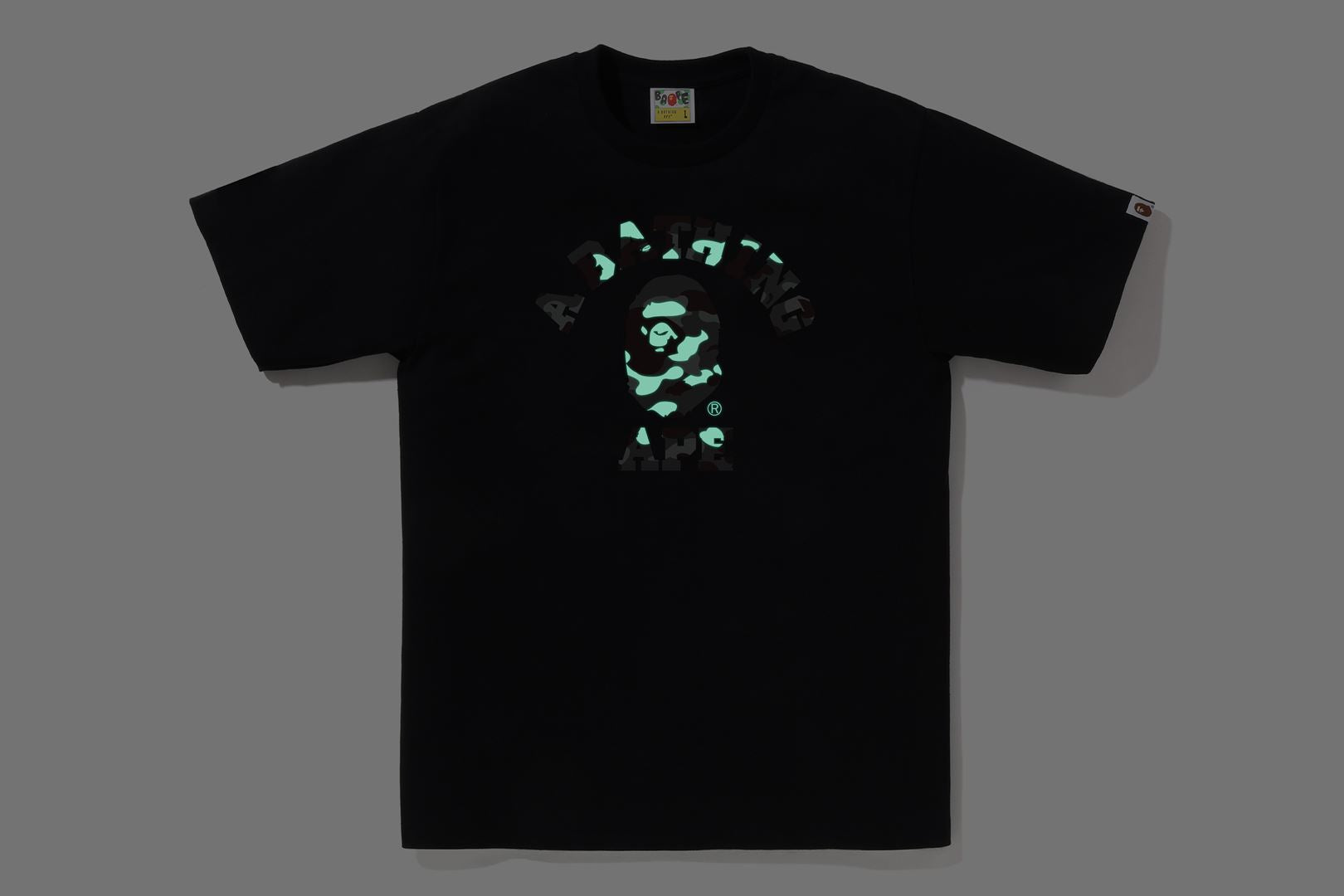 BAPE Men’s Cotton City Camo College T-Shirt – Glow-in-the-Dark Logo. This short-sleeve BAPE City Camo College T-Shirt features the COLLEGE logo in a stylish CITY CAMO print with a cool glow-in-the-dark effect. Regular fit, it’s available in black and white. It’s perfect to wear alone or layered for added style.