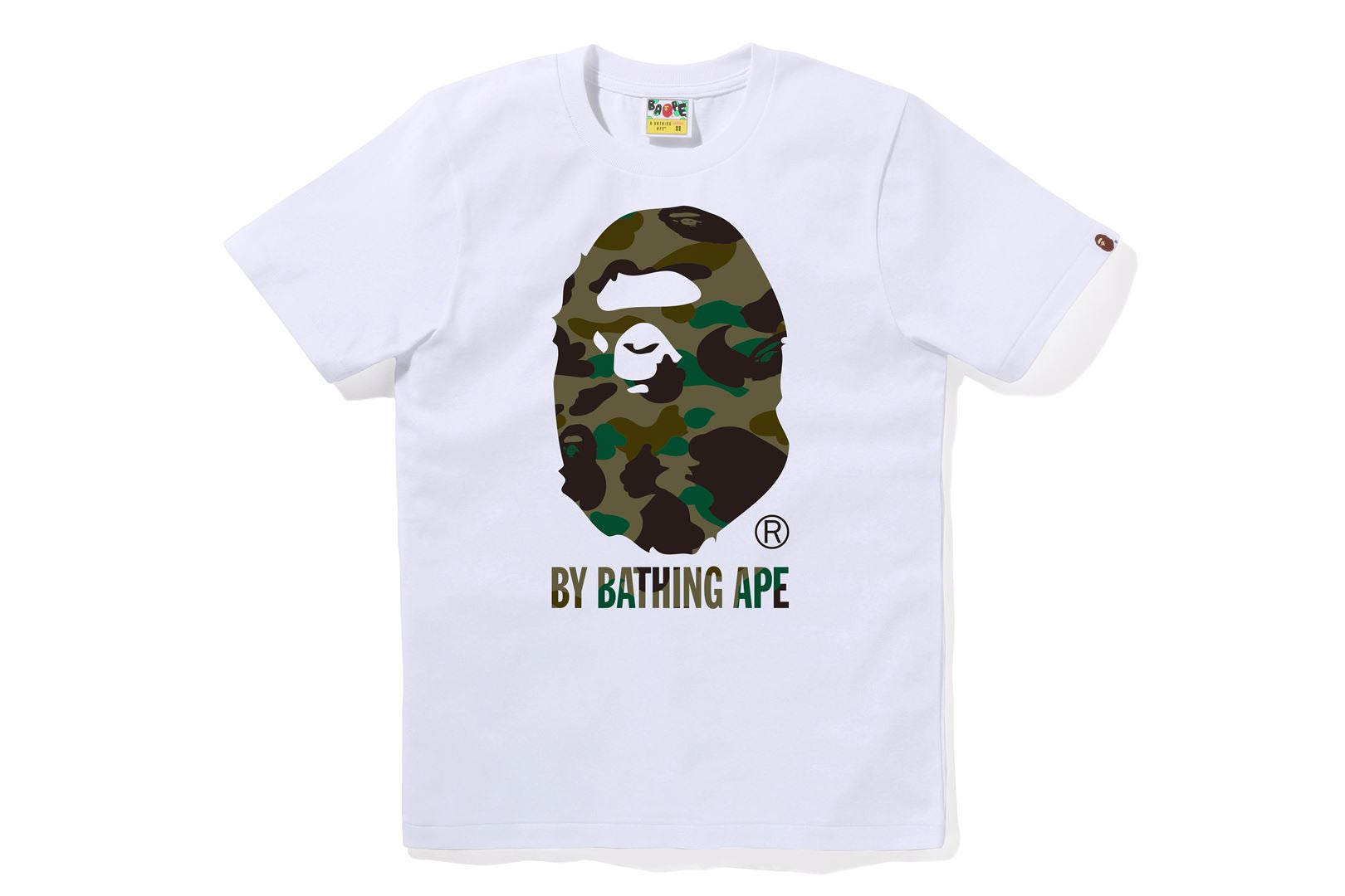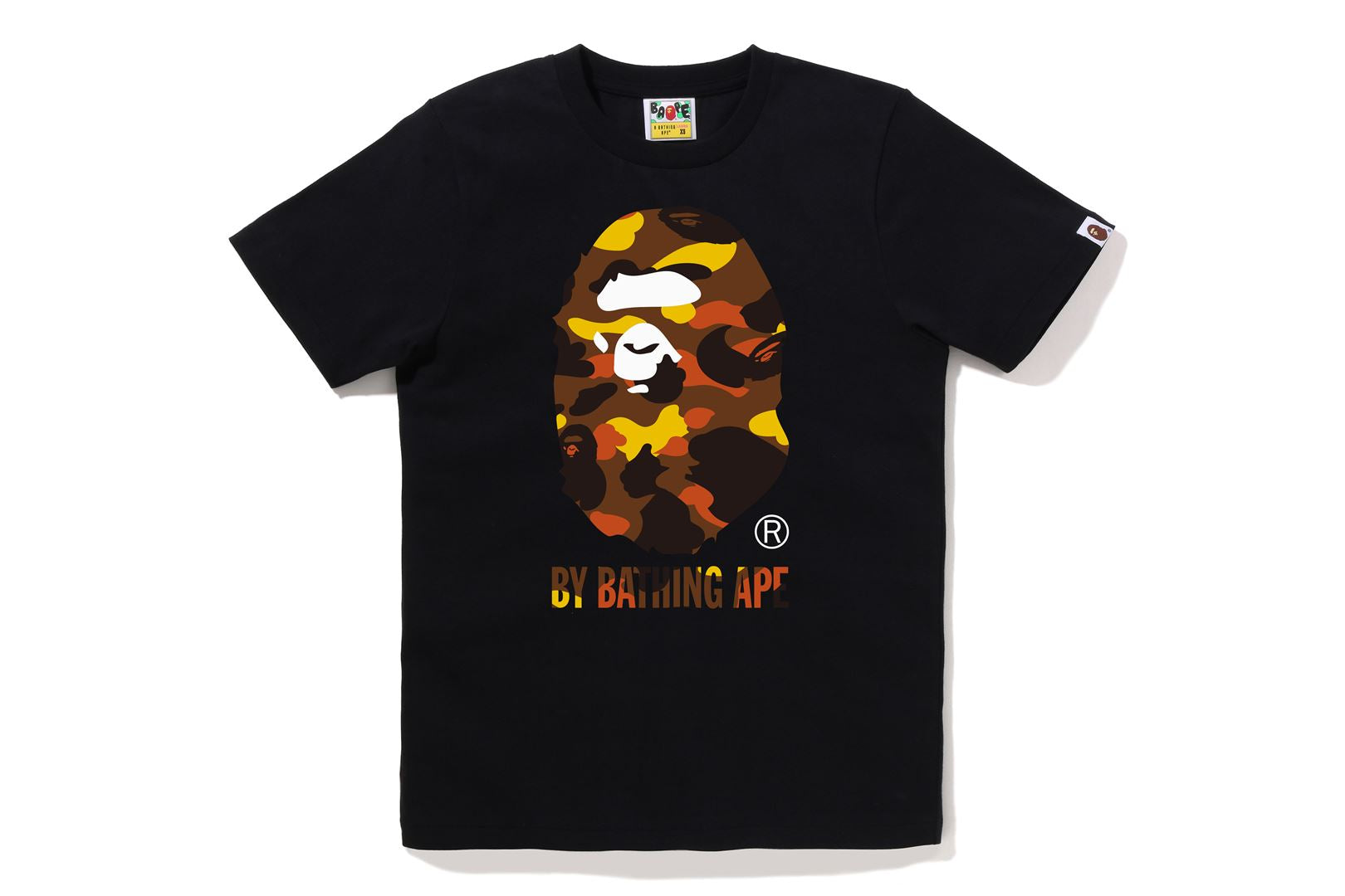 BAPE WOMENS COTTON 1ST CAMO BY BATHING APE T-SHIRT showcases a camo-patterned Ape Head across the chest with the signature logo below, designed to provide a flattering fit. This season, it arrives in a vibrant orange camo shade for a lively and updated style.