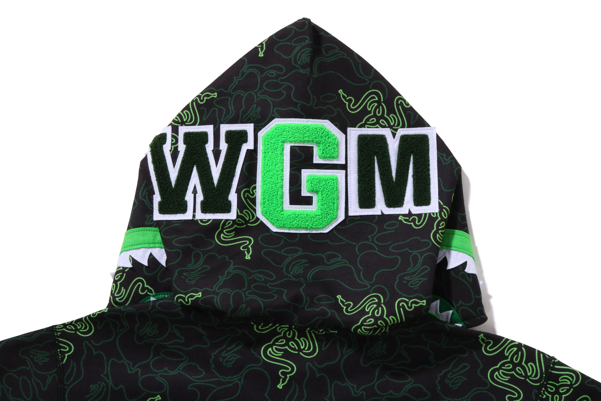 The Shark full-zip hoodie transforms fans into the iconic shark head features BAPE®'s WGM (World Gone Mad) motif. The hoodie also features an intricate 'A Gaming Ape' embroidery patch.