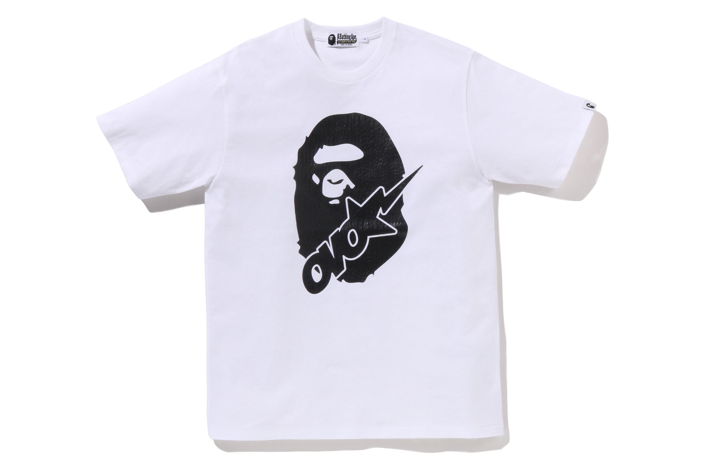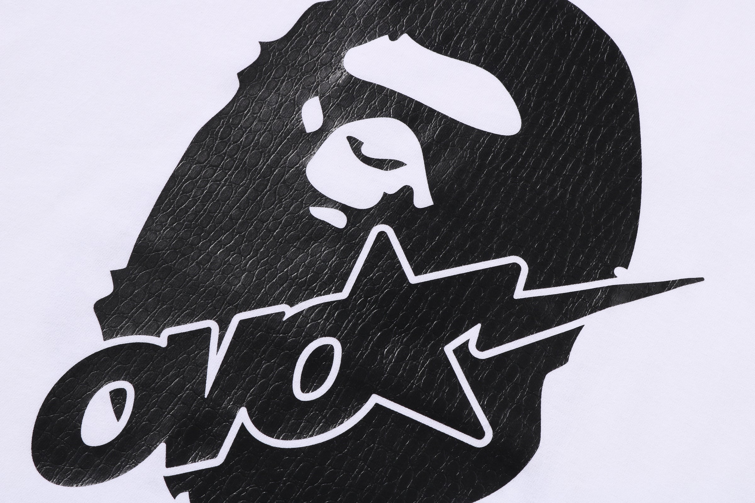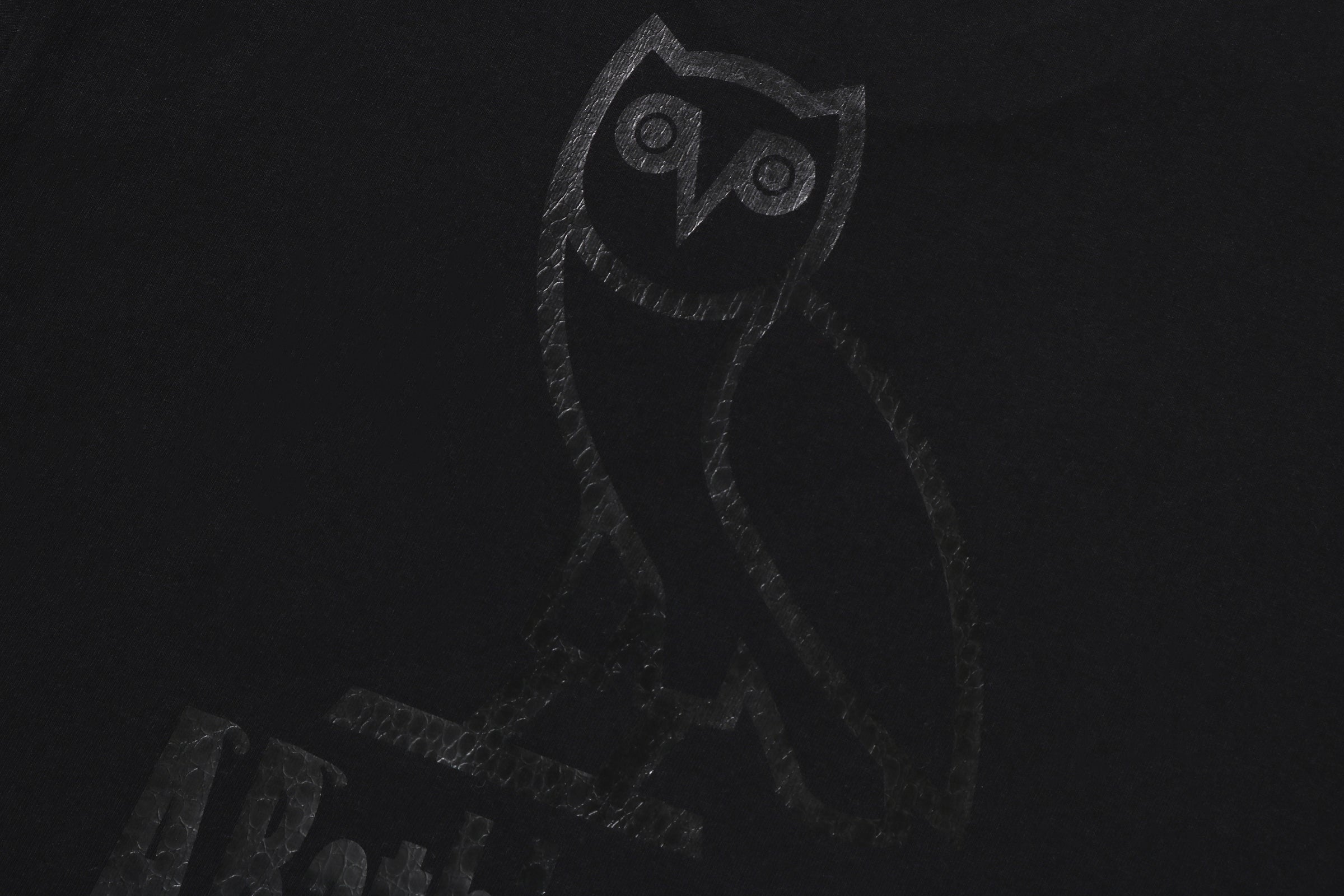 The tees, available in white and black, include embossed crocodile-texture graphics that combine the APE HEAD and OVO STA. The black embossing matches the body color for a subtle yet striking contrast. The back is printed with OWL, A Bathing Ape®, and OCTOBER’S VERY OWN.