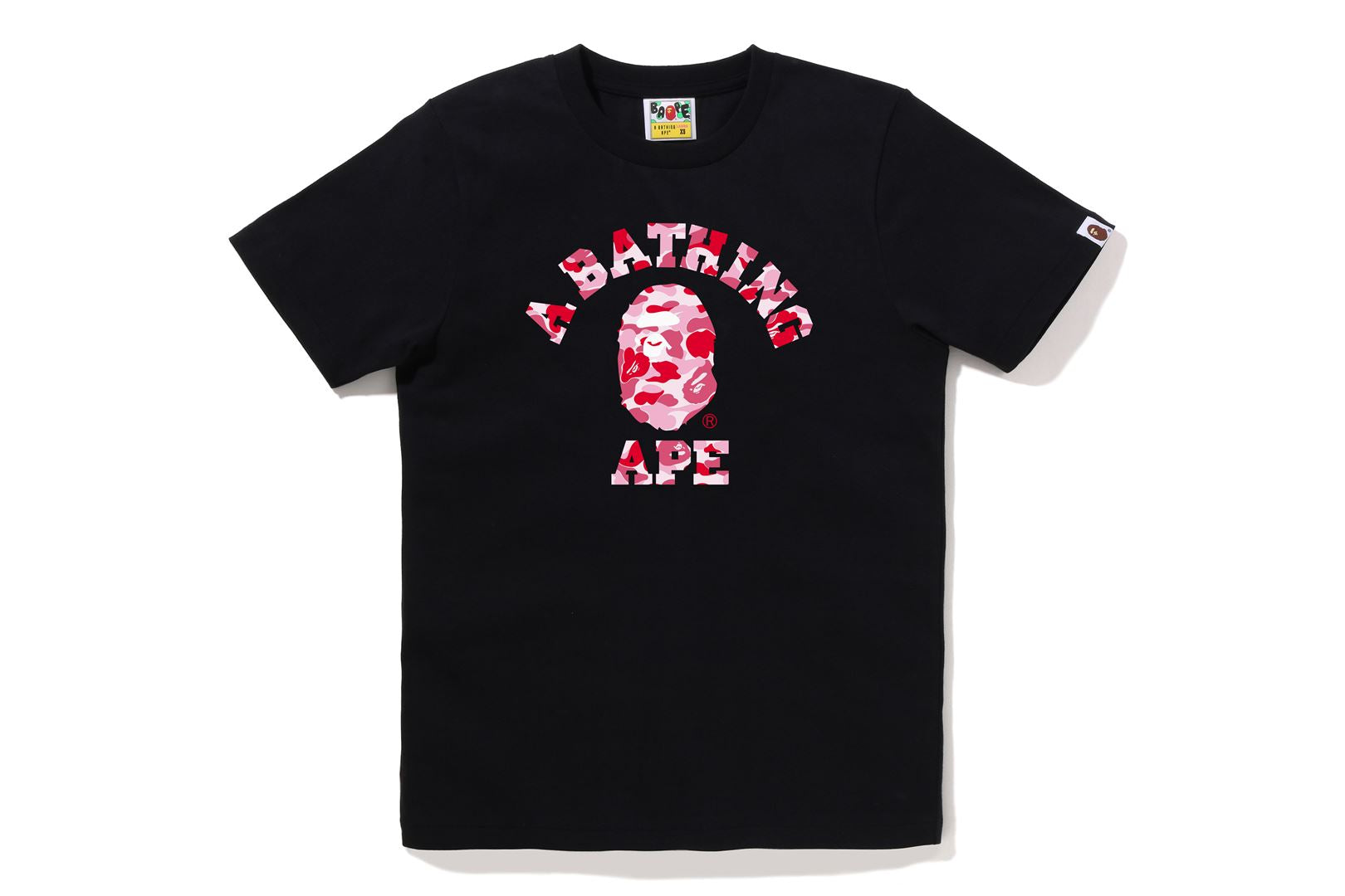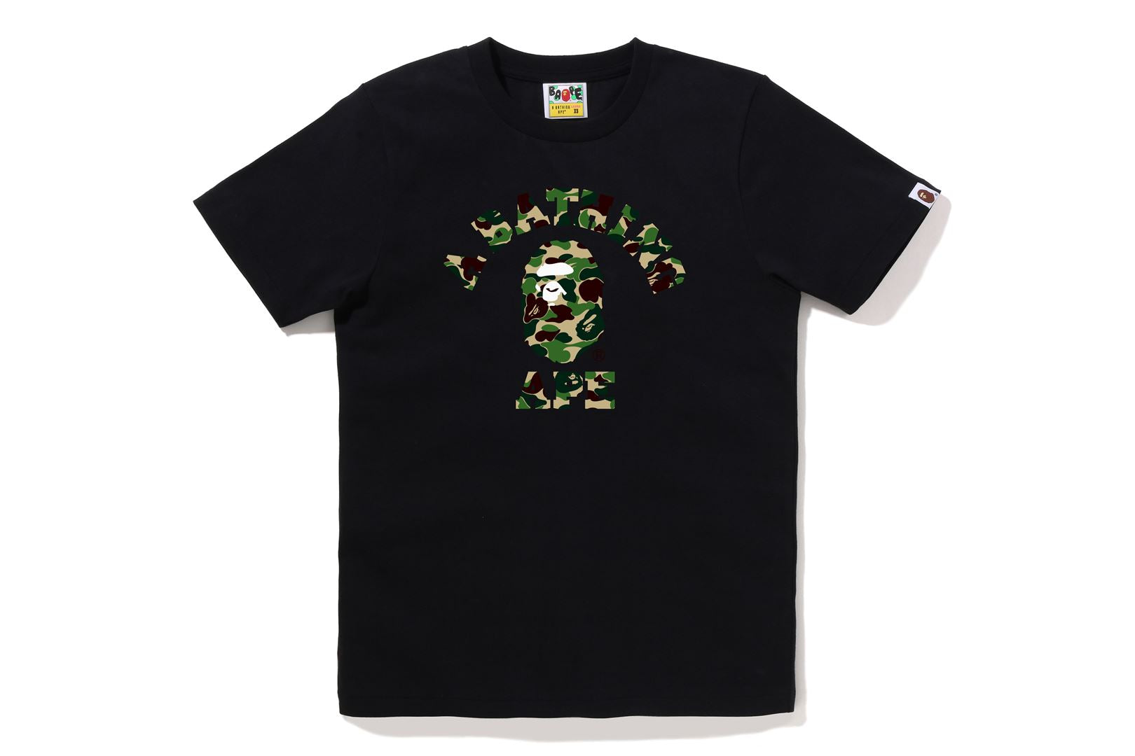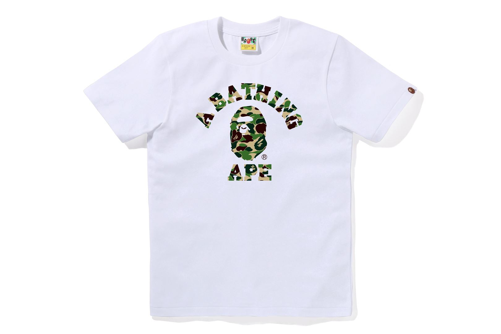 BAPE WOMENS COTTON ABC CAMO COLLEGE T-SHIRT features a camo-filled Ape Head and text graphic across the chest. Designed in a classic women’s fit, it blends signature BAPE style with everyday comfort.
