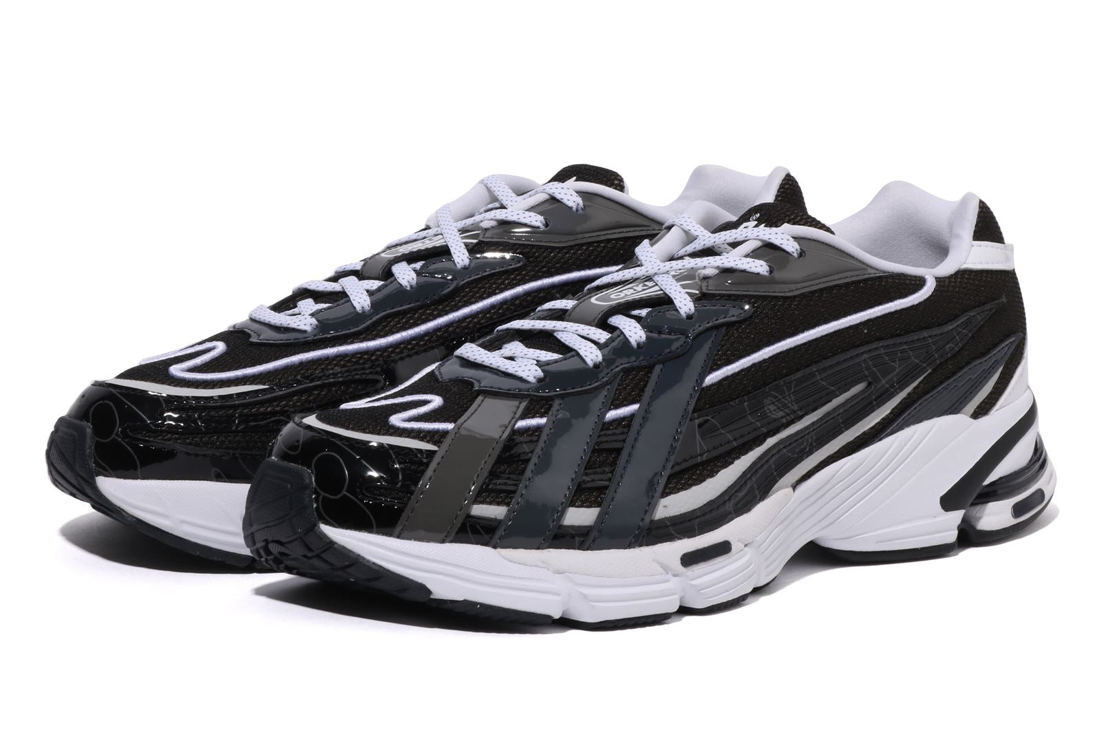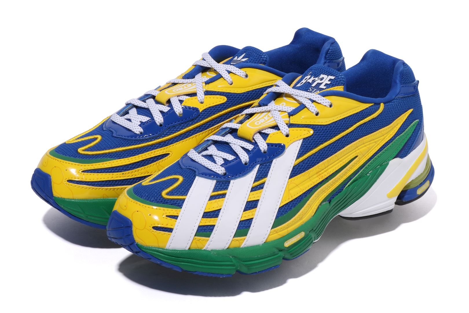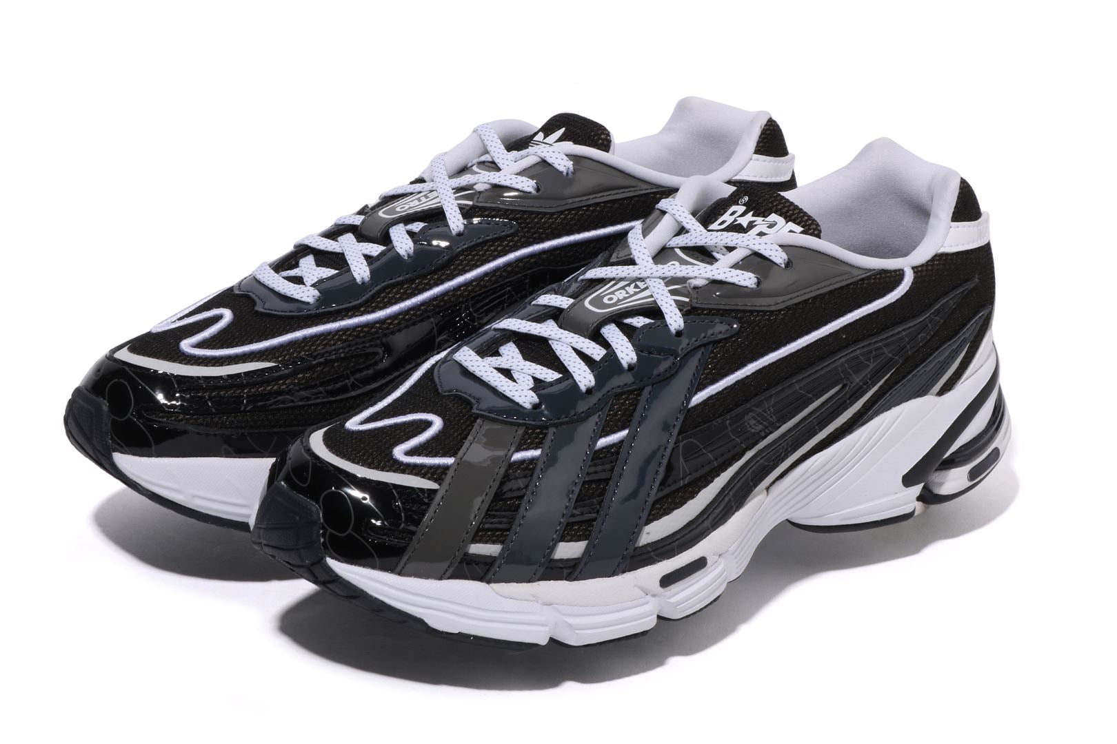A BATHING APE and adidas Originals reunite to present a fresh take on the Orketro silhouette, originally designed in Tokyo and inspired by the bold spirit of the 2000s. This collaboration highlights contrasting three stripes on the left shoe and the iconic BAPE STA on the right. Combining mesh and enamel leather, it features the signature BAPE STA Y2K colorway alongside a 1ST LINE CAMO update on the upper overlay. Co-branded details from both labels complete this standout design with style and attitude.