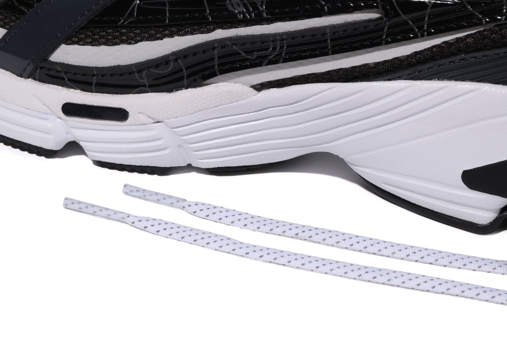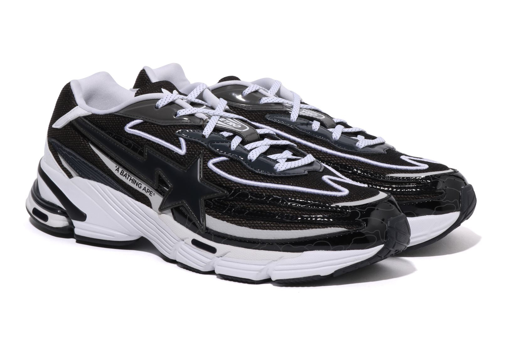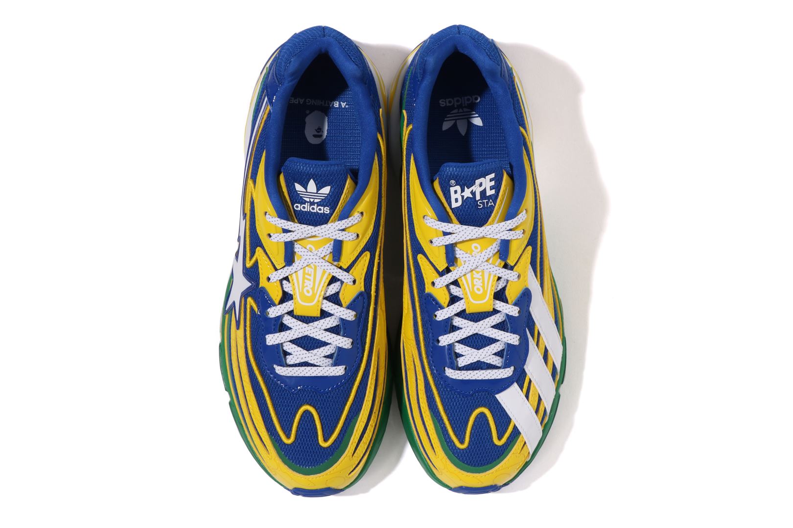 A BATHING APE and adidas Originals reunite to present a fresh take on the Orketro silhouette, originally designed in Tokyo and inspired by the bold spirit of the 2000s. This collaboration highlights contrasting three stripes on the left shoe and the iconic BAPE STA on the right. Combining mesh and enamel leather, it features the signature BAPE STA Y2K colorway alongside a 1ST LINE CAMO update on the upper overlay. Co-branded details from both labels complete this standout design with style and attitude.