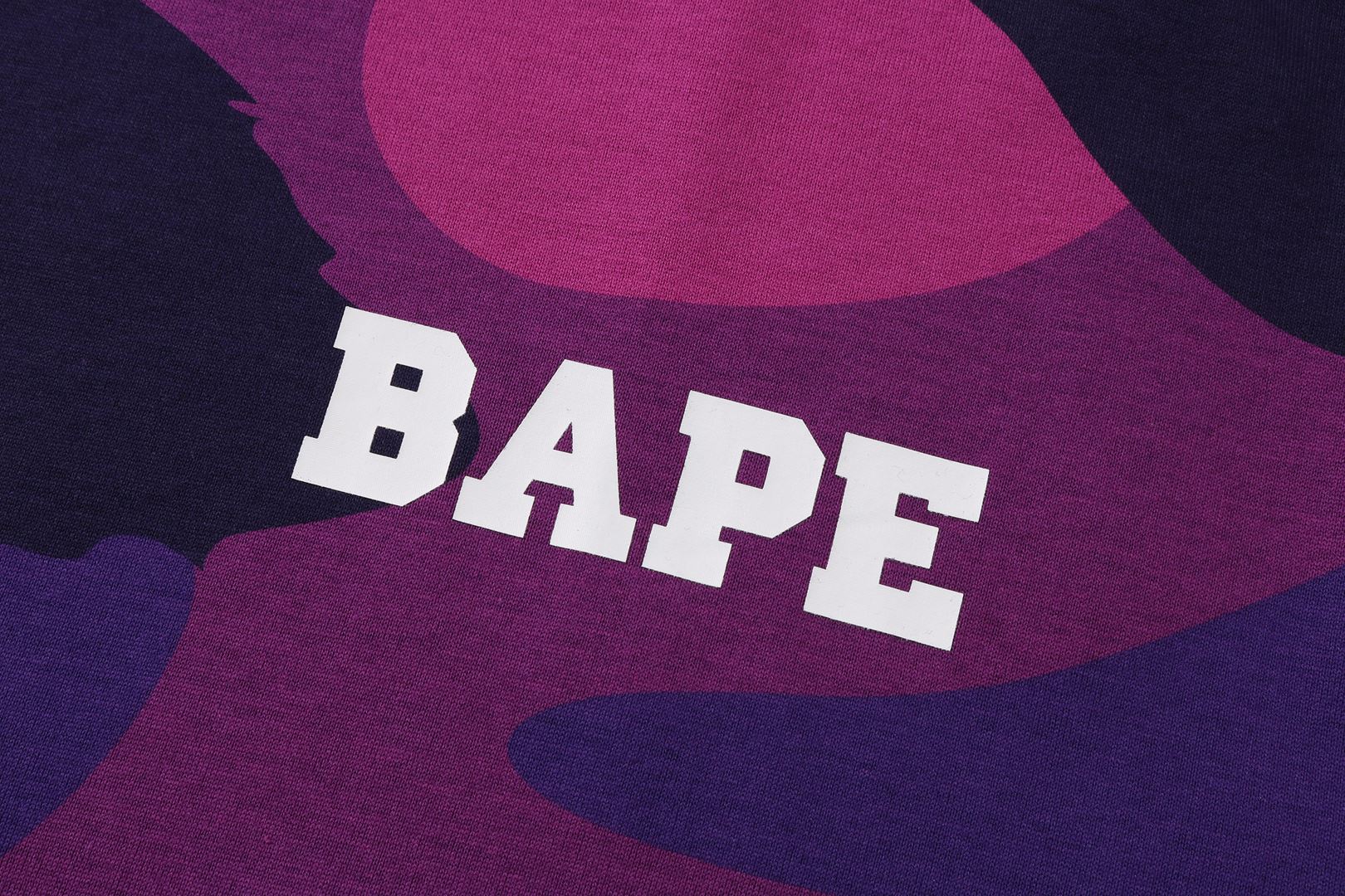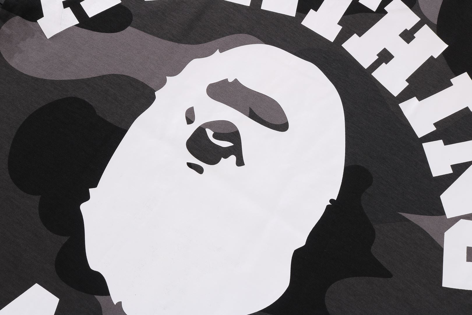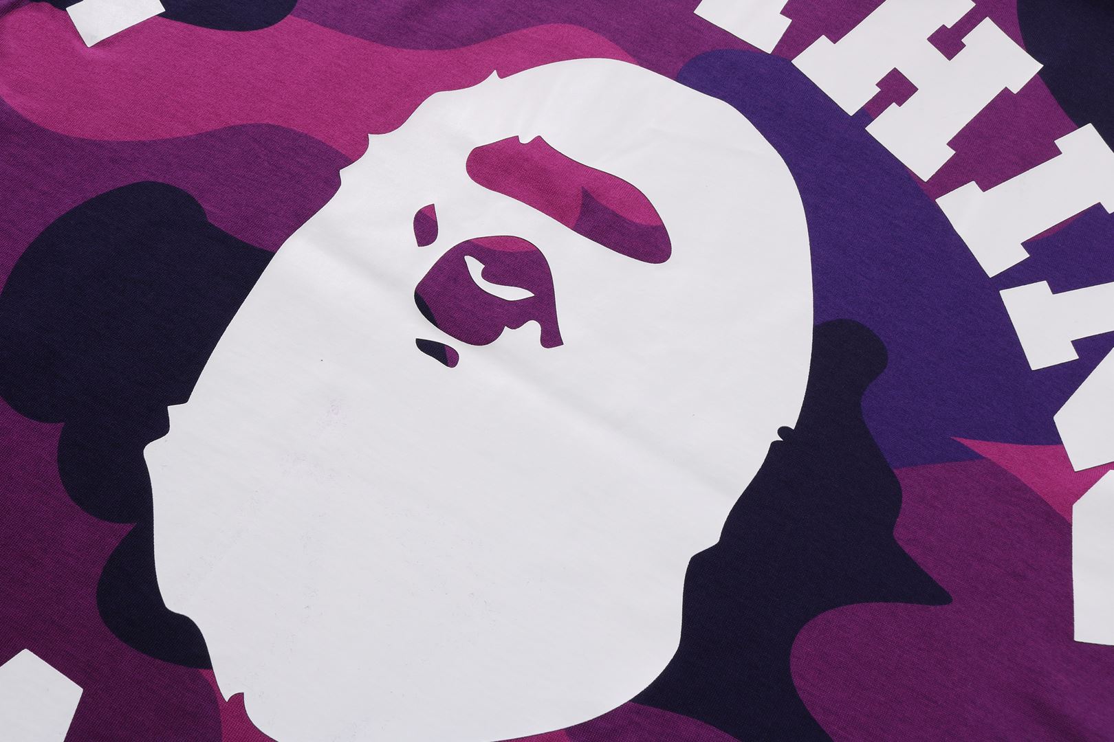 This comfy tee features a colorful camo pattern, soft cotton fabric, and relaxed fit for all-day ease. It shows BAPE on the front and COLLEGE on the back.