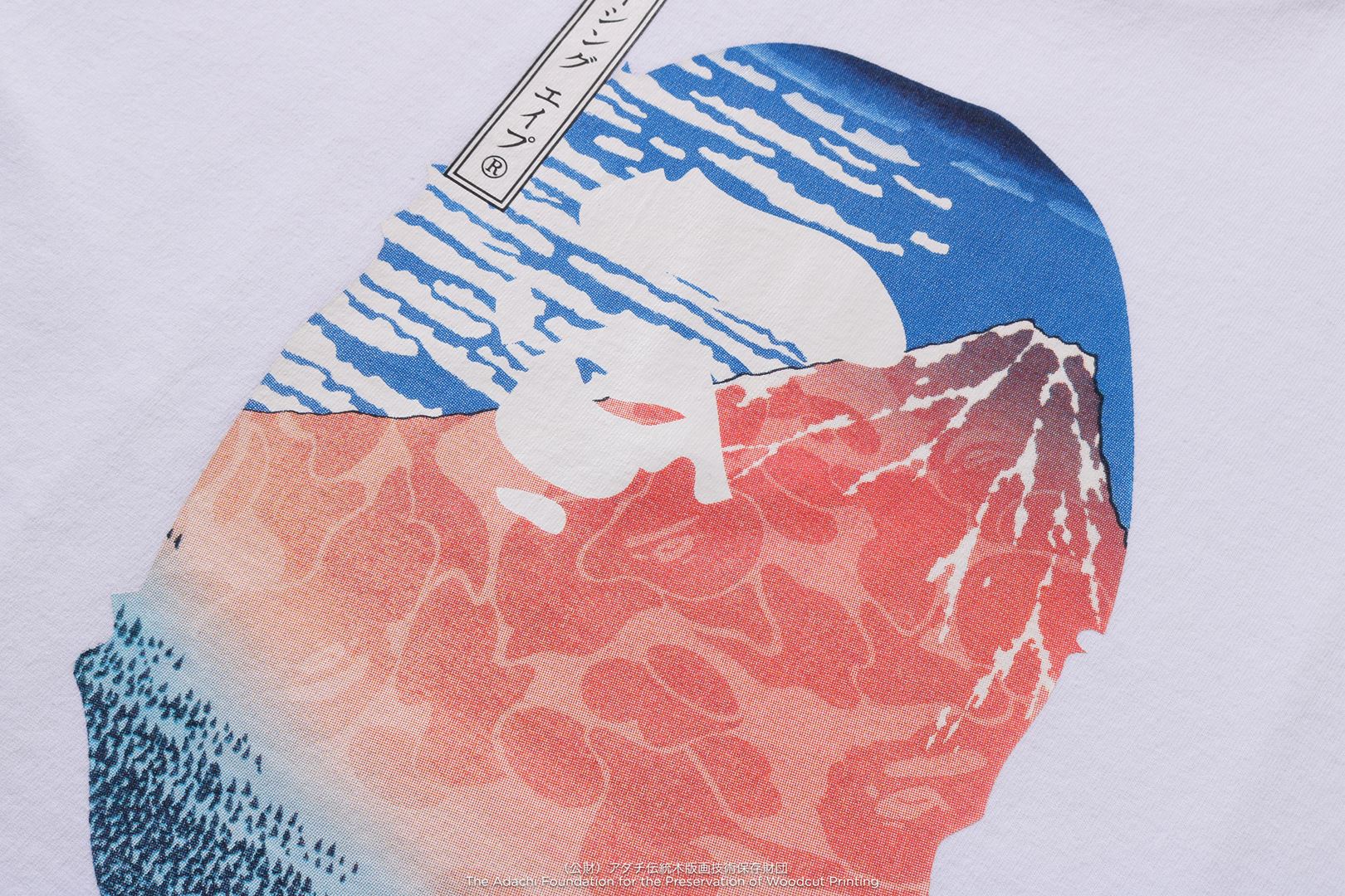 The T-shirts come in four styles, each featuring APE HEAD graphics that incorporate iconic artworks by Hokusai and Kuniyoshi. These legendary pieces are reimagined in vibrant BAPE CAMO and framed within the APE HEAD silhouette, with the BAPE brand name laid out in Katakana. Each design also features the artist’s rakkan (signature seal) printed on the left sleeve. Available in three colors: white, black, and navy.
