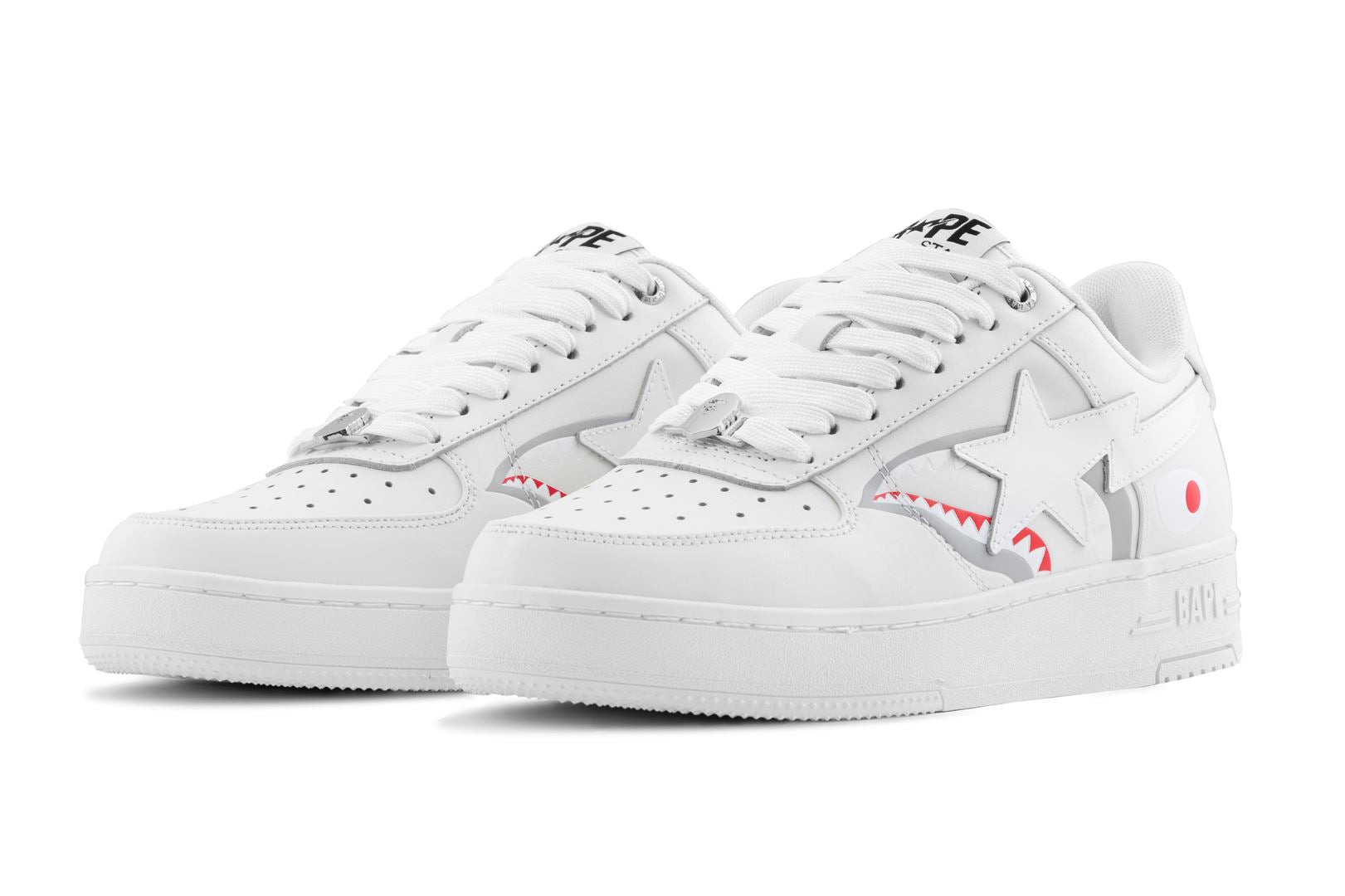 BAPE WOMENS STA SHARK SNEAKER SHOE features the classic shark motif paired with a supple premium calf leather upper for lasting comfort and strength. Shiny patent leather STA logos provide a sleek finish, making these sneakers a bold highlight in your wardrobe.