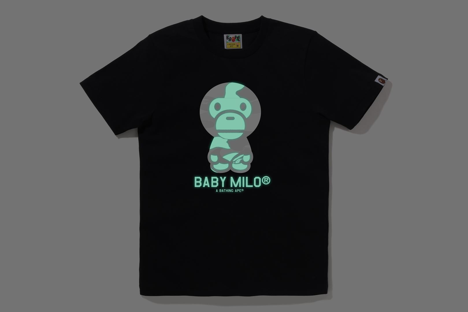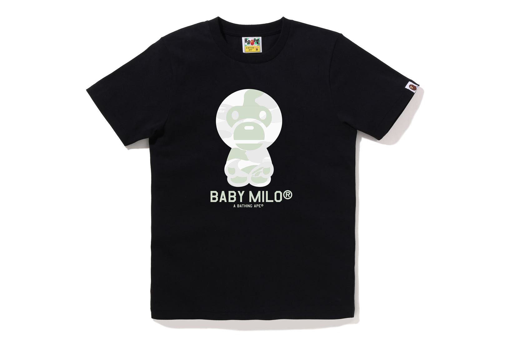 BAPE WOMENS COTTON CITY CAMO BABY MILO T-SHIRT features the iconic BABY MILO character printed in a bold CITY CAMO pattern, crafted with a unique glow-in-the -dark fabric for a standout look.