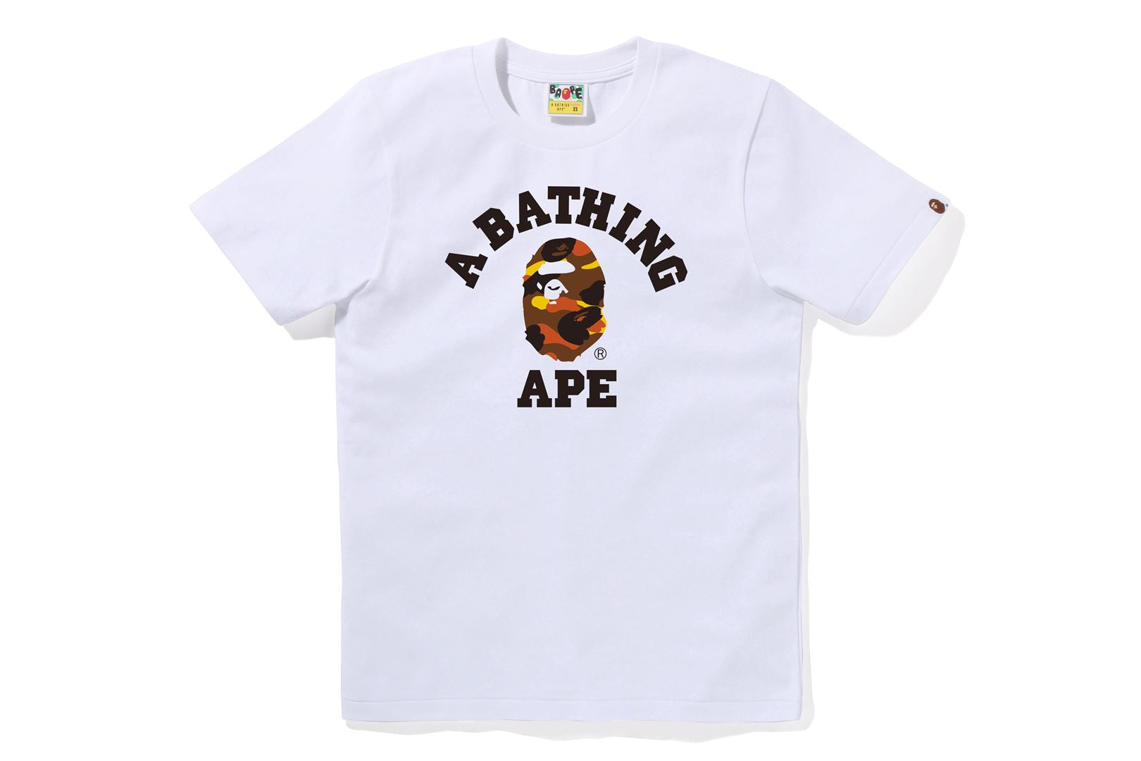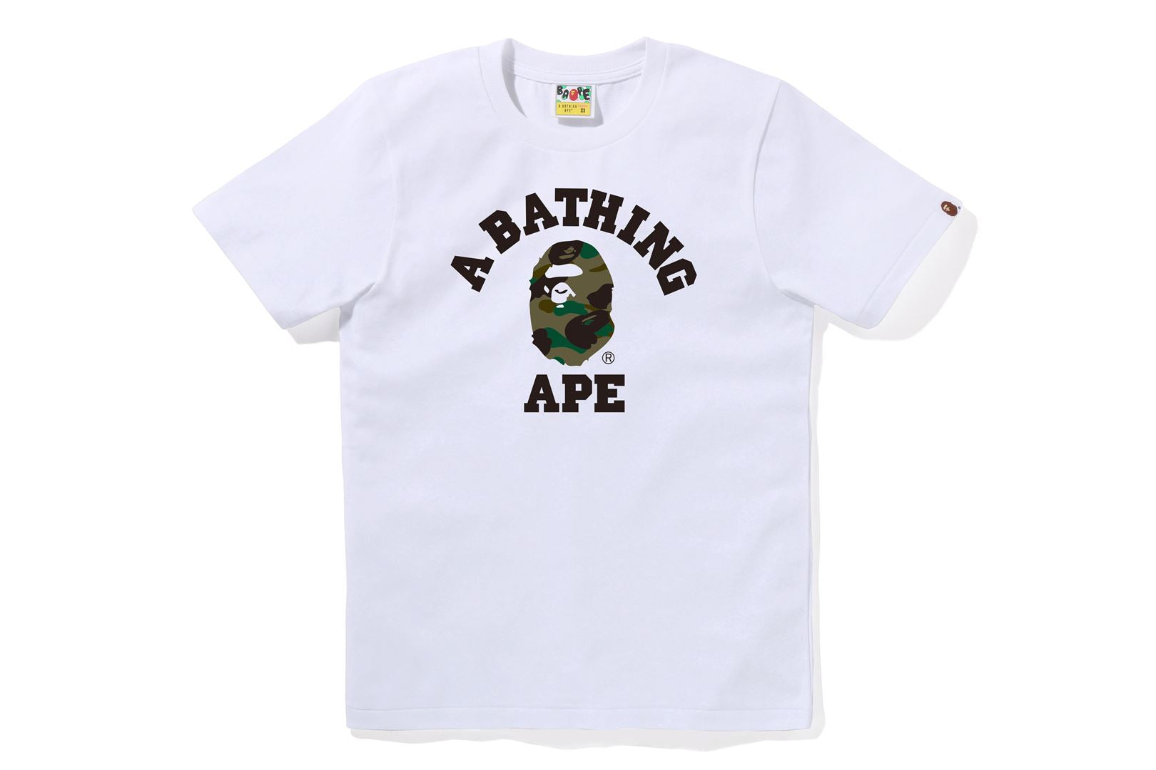 BAPE WOMENS COTTON 1ST CAMO COLLEGE T-SHIRT is crafted from high-quality USA cotton, featuring a unique round-body shape. The front showcases a rubber-printed APE HEAD logo in a distinctive 1ST CAMO pattern, while a pin label adds a subtle detail on the left sleeve. Designed with a comfortable regular fit, it comes in BLACK and white sizes 2XS to M.