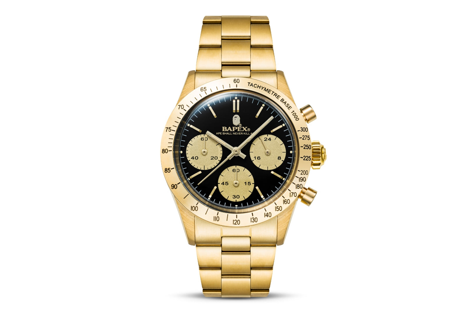 BAPE® offers a vintage all-gold version of TYPE 4 BAPEX® with exceptional detail and a traditional black and gold bracelet. It is highly regarded by watch enthusiasts for its elegance, durability, and high standards, including a scratch-resistant sapphire window and 100-meter water resistance.
