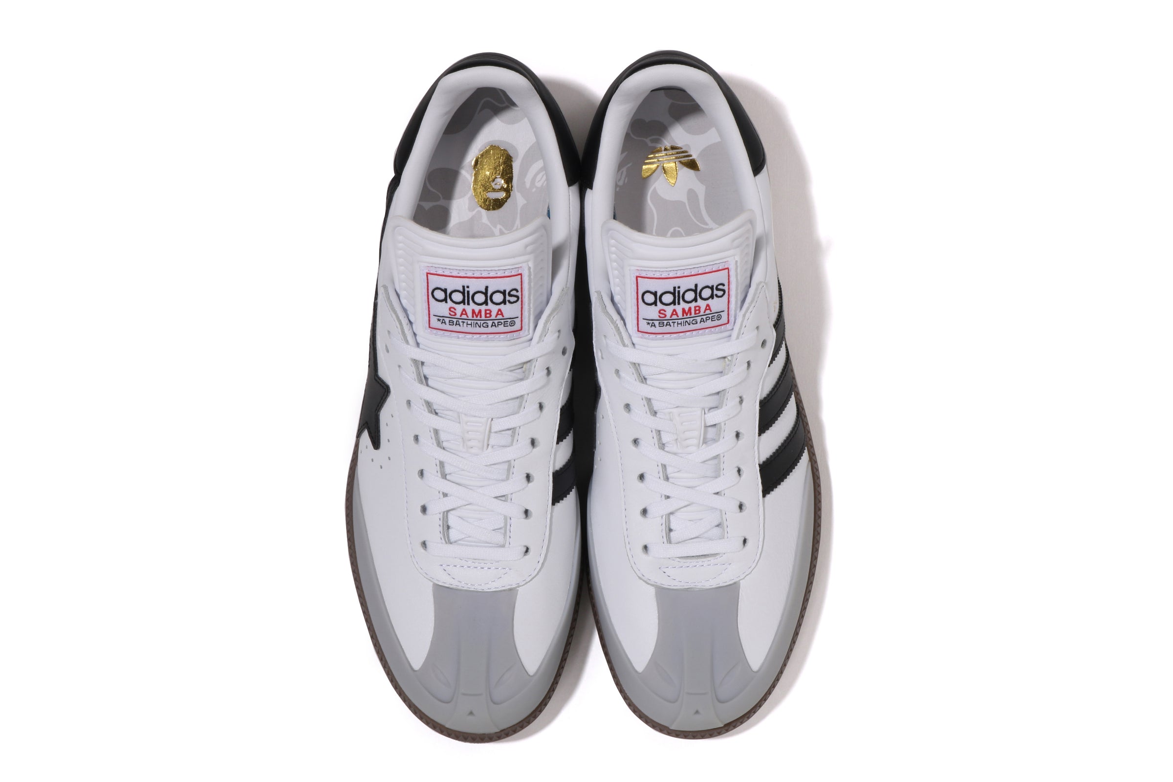Moving from the field to the street, BAPE® has brought its distinct lens to the iconic adidas Originals Samba sneaker. First made for soccer and now a certified lifestyle icon, the legendary Japanese label has reimagined the classic silhouette with an aniline grained leather upper – all-the-while swapping out the signature suede toe box overlay for a SKULL STA face in a rubber finish. The right shoe then features a BAPE STA™ on the lateral, with 3-Stripes on the medial, while the left shoe boasts the inverse treatment. Each pair is completed with gold foil detailing, co-branded camo sock liners, and is available in two distinct colorways: white with black and grey details, as well as black with white accents.